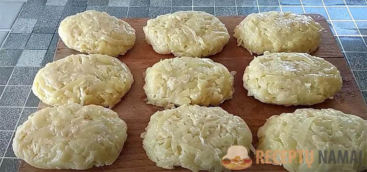 Iškeptas bulves sumaišykite su miltais, tarkuotu sūriu, pipirais ir druska.