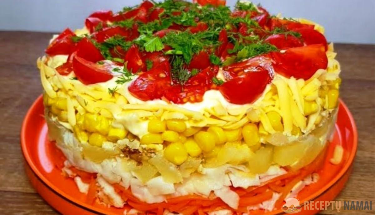 . Kukurūzų sluoksnį uždenkite majonezu, ant jo užbarstykite stambiai tarkuotą sūrį. Sūrio sluoksnį