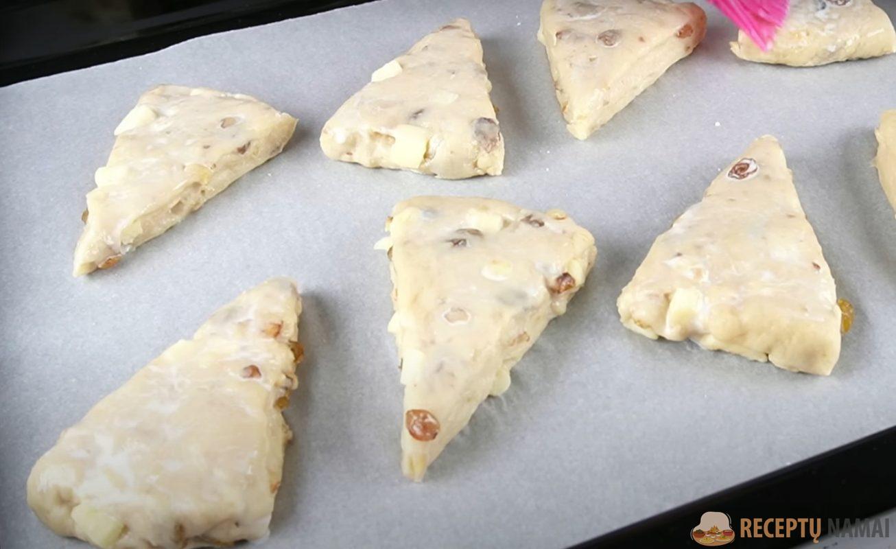 plokštainį. Plokštainį padalykite į 8 vienodus trikampius ir sudėkite juos ant pergamentu išklotos kepimo skardos. Patepkite sausainius pienu ir kepkite 180 laipsnių temperatūroje 20-25 minutes.