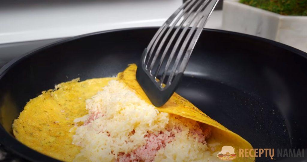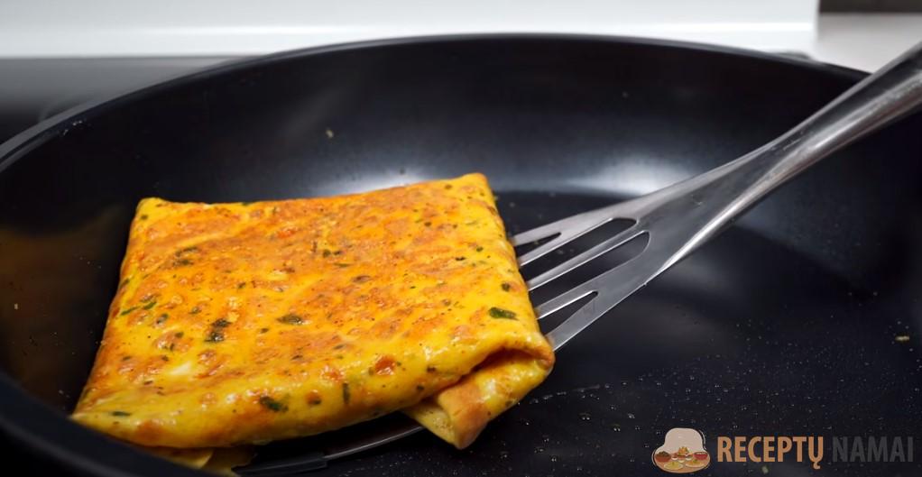 . Į keptuvę supilkite šiek tiek masės ir kepkite, kol viršus sulips.