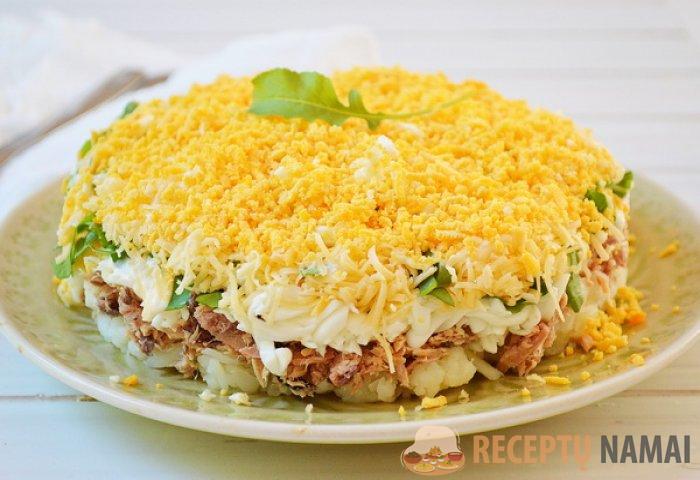 Salotas išdėliojame sluoksniais, kiekvieną sluoksnį aptepdami majonezu: tarkuotos bulvės, skumbrė, smulkiai pjaustyti svogūnai, tarkuotas baltymas, smulkintos žolelės, tarkuotas sūris, tarkuoti kiaušinių tryniai.