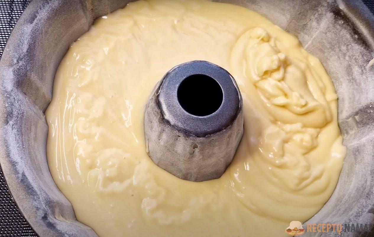 . Atskirame dubenyje sumaišykite miltus ir kepimo miltelius, persijokite į mišinį, išminkykite tešlą. Kepimo formą pabarstykite miltais ir supilkite į ją tešlą