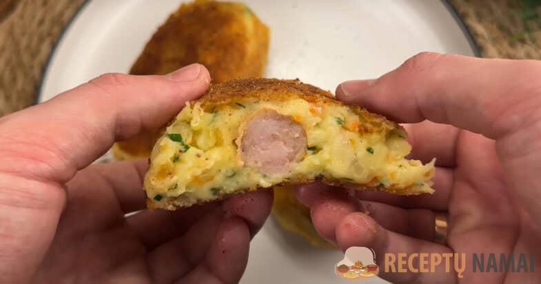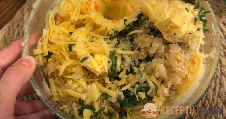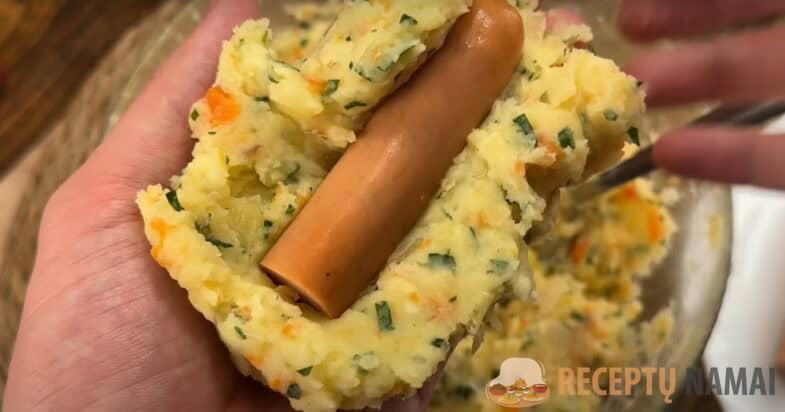 Į tyrę sudėkite virtus svogūnus. Į tyrę įmaišykite susmulkintą česnaką. Suberkite petražoles ir tarkuotą sūrį. Kruopščiai išmaišykite. Suformuokite rutuliukus, suplokite juos delne, į vidurį įdėkite pusę dešrelės. Įdarykite įdarą, kad gautųsi pyragas.