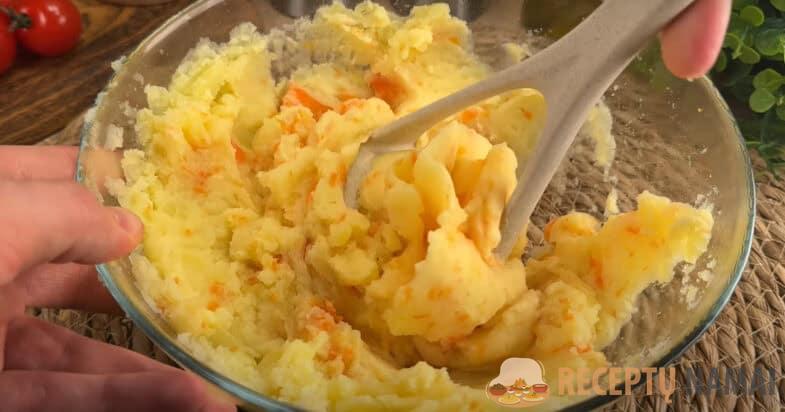 Nulupkite bulves ir morkas, sudėkite jas į puodą ir virkite, kol suminkštės. Išverskite į tyrę, įdėję šiek tiek sviesto. Taip pat keptuvėje ištirpinkite gabalėlį sviesto ir pakepinkite smulkintą svogūną, kol apskrus.