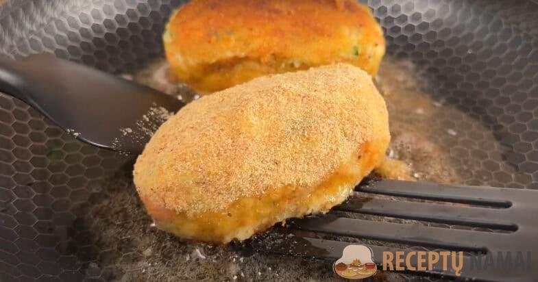 Įmerkite pyragėlį į plaktus kiaušinius, tada į džiūvėsėlius. Kepkite įkaitintoje keptuvėje su augaliniu aliejumi, kol paruduos