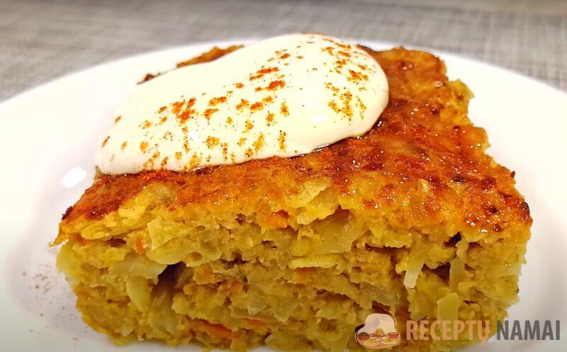 Svogūną smulkiai supjaustykite, morkas sutarkuokite. Į keptuvę įpilkite truputį lieso aliejaus, įkaitinkite jį ir sudėkite svogūnus. Kepkite, kol paruduos. Sudėkite morkas ir kepkite, kol suminkštės. Tuo tarpu supjaustykite kopūstus. Sudėkite jį į keptuvę. Pagardinkite druska, išmaišykite ir palaukite, kol suminkštės.