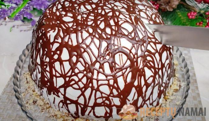 . Glajų supilkite ant torto viršaus, uždenkite plokščia lėkšte. Palikite tortą šaldytuve 2-3 valandoms. Tada nuimkite žiedą ir kremu aptepkite torto šonus.