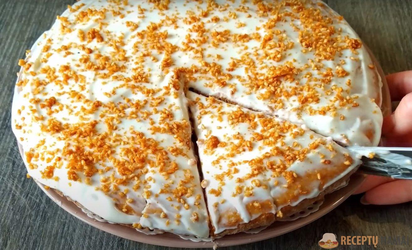 į kepimo formą ir kepkite 180 laipsnių temperatūroje pusvalandį. Kremui grietinę sumaišykite su cukraus pudra
