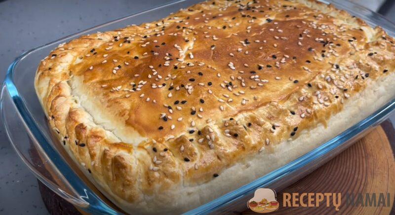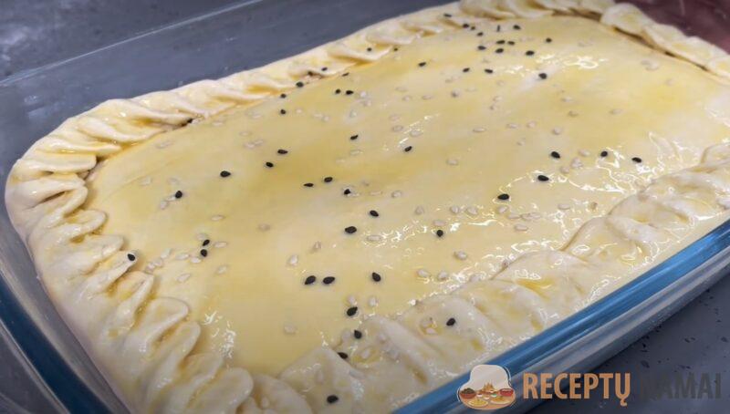 Įmuškite kiaušinį ir patepkite juo pyrago viršų. Apibarstykite sezamo sėklomis (nebūtina) ir kepkite 180 laipsnių temperatūroje pusvalandį. Skanus, kvapnus pyragas be jokio vargo paruoštas.