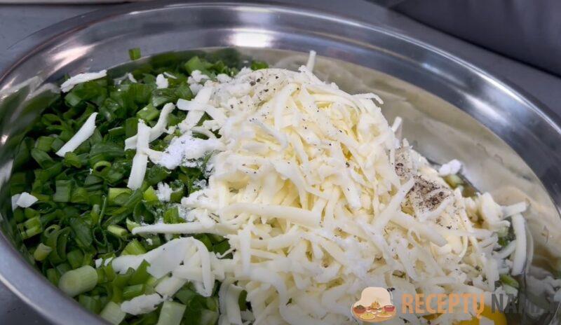 Svogūną smulkiai supjaustykite, į jį įmuškite kiaušinius (3 vnt.). Sūrį stambiai sutarkuokite ir sudėkite į svogūnus. Pasūdykite ir pabarstykite pipirais. Viską išmaišykite.