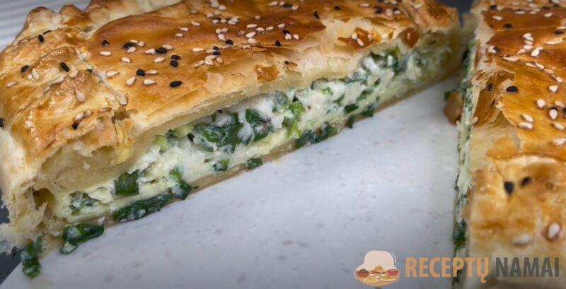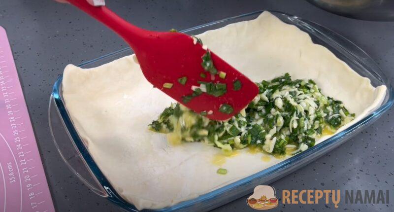 Pagal formos dydį iškočiokite vieną tešlos lakštą. Padėkite jį ant dugno. Ant viršaus užtepkite ploną įdaro sluoksnį ir uždenkite antru tešlos lakštu, prieš tai jį iškočioję. Kraštus reikia užspausti, kad gaminys įgautų pyrago formą