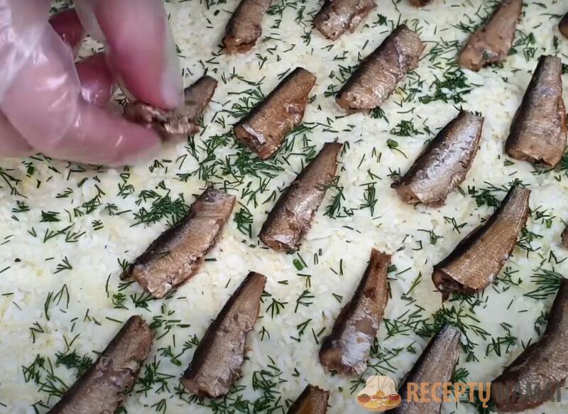 Nupjaukite šprotų uodegas, lydytą sūrį sutarkuokite smulkia tarka. Išvirkite kiaušinius ir juos taip pat smulkiai sutarkuokite. Sumaišykite sūrį ir kiaušinius. Įpilkite majonezo. Druska, pipirai. Česnakus išspauskite per presą