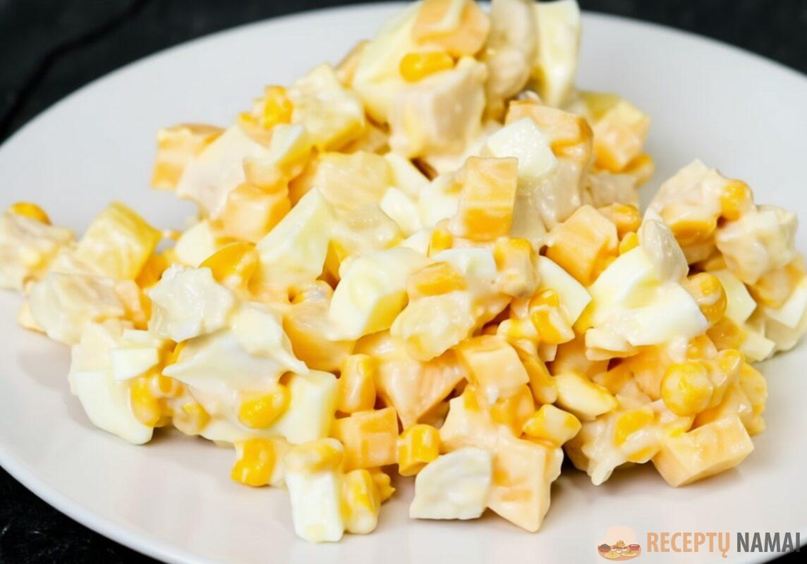 - Į salotas supilkite kukurūzus, užpilkite majonezu ir gerai išmaišykite.