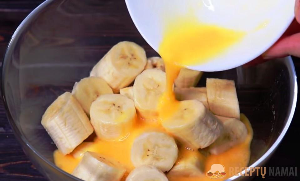 . Kiaušinius suplakite plaktuvu, supilkite į bananus ir panardinamuoju mikseriu išplakite masę iki vientisos masės.