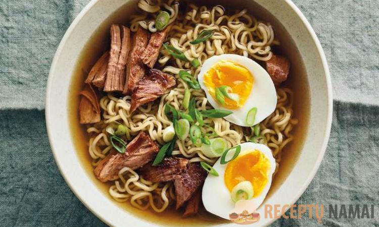 Belieka tik greitai išvirti porą kietai virtų kiaušinių ir sudėti juos į doširaką. Štai ir viskas, puiki sriuba, soti ir ryškaus, sodraus skonio, paruošta. Jei norite, į sriubą taip pat galite įdėti šiek tiek mėsos – taip ruošiami klasikiniai ramen makaronai