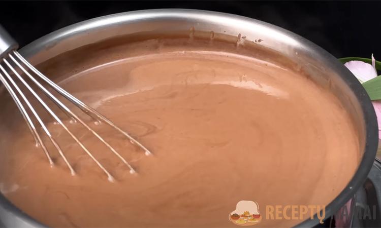 Supilkite pieną į puodą, suberkite agar-agarą, išmaišykite. Tada iš karto pastatykite ant viryklės ir sudėkite “Nutella”.