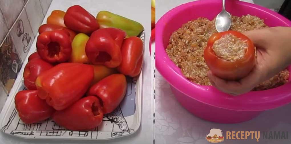 Tai darykite labai atsargiai, kad paprikos liktų nepažeistos. Įdarui galite naudoti bet kokią maltą mėsą – jautieną, vištieną, kiaulieną, kalakutieną. Arba pagaminkite dviejų rūšių mėsos mišinį.