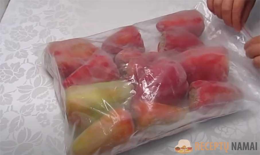 Tada išimkite ir perpjautas per pusę paprikas sudėkite į šaldymo maišelius, sandariai užriškite ir grąžinkite atgal į saugyklą. Jei turite įprastą maišelį, tiesiog tvirtai jį užriškite.