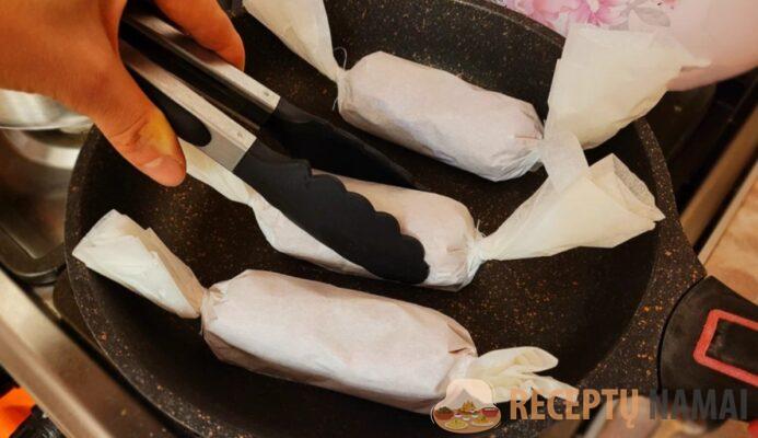 Išdėliokite kopūstų lapus ant lygaus paviršiaus. Ant kiekvieno jų krašto uždėkite faršo ir susukite. Kepkite iš abiejų pusių, kol paruduos