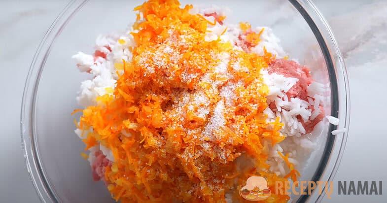 Į keptuvę įpilkite augalinio aliejaus ir pastatykite ant ugnies. Smulkiai supjaustykite svogūną ir kepkite, kol paruduos. Sutarkuokite morkas ir nusiųskite jas prie svogūnų. Kartu palaikykite daržoves keptuvėje 3-4 minutes. Nuimkite keptuvę nuo viryklės ir supilkite jos turinį į maltinukus. Pasūdykite, pagardinkite pipirais, supilkite pieną ir vandenį. Gerai išmaišykite.