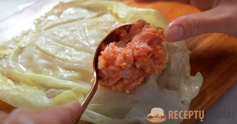 Iš kopūstų pašalinkite šerdis. Į didelį puodą supilkite vandenį ir pastatykite ant ugnies, kad užvirtų. Kai pasirodys burbuliukai, nuleiskite į jį kopūstus. Virkite 5-10 minučių. Per tą laiką viršutinis lapas turi suminkštėti. Atsargiai jį išimkite ir palaukite, kol bus paruoštas kitas. Taigi reikia išardyti visą kopūstą. Lapus atvėsinkite ir nupjaukite tirščius.