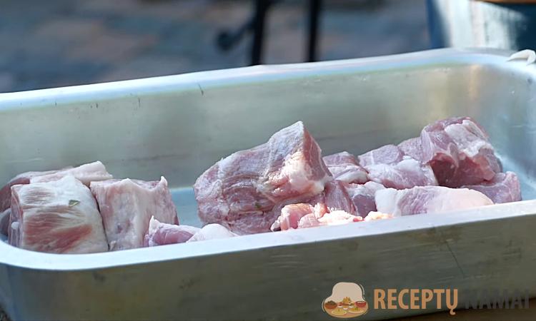 1. Kiaulienos sprandinę supjaustykite dideliais kubeliais, maždaug 4–5 cm ilgio kiekvieno šono. Stenkitės, kad gabalėliai būtų vienodo dydžio – taip jie tolygiai keps. Sudėkite gabalėlius į didelį emaliuotą arba stiklinį dubenį/puodą.