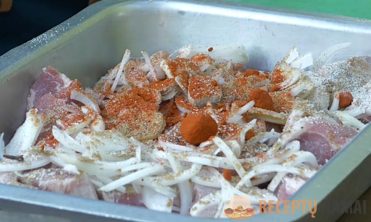 4. Išimkite mėsą iš marinato, leiskite nuvarvėti skysčio pertekliui. Tvirtai, bet ne per stipriai, suverkite gabalėlius ant iešmelių, užpildydami viršutinius 2/3 iešmelio ilgio. Verkite „banguodami“ ir skersai pluošto, kad mėsa geriau laikytųsi ir nenuslystų.
