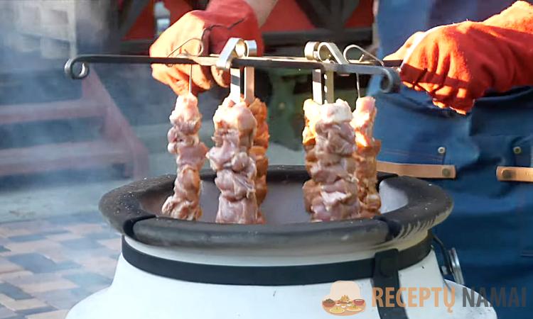 6. Užmaukite iešmelius ant kryželio arba laikiklio taip, kad jie nesiliestų. Nuleiskite kryželį į tandūrą ir uždenkite dangčiu. Kepimo metu neatidarykite dangčio – temperatūra sumažės ir mėsa iškeps netolygiai.