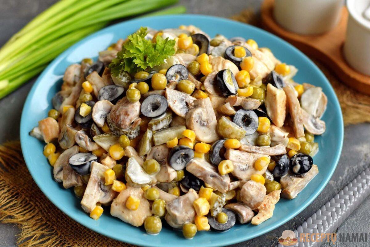Raugintus agurkus supjaustykite kubeliais, alyvuoges – žiedais.