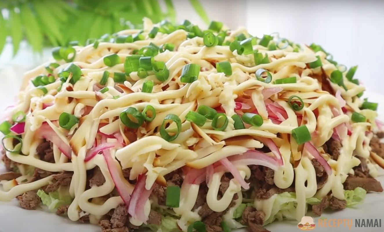 Į kepenų salotų sudėtį įeina tokie ingredientai kaip jautienos arba vištienos kepenys