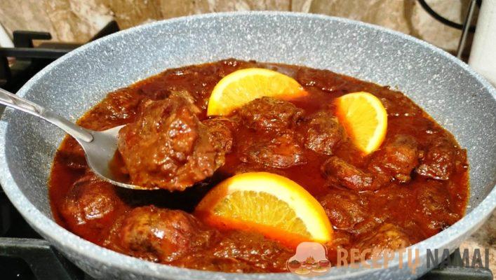Nepamirškite pridėti cukraus ir acto!!! Šių produktų sudėtyje nėra daug, tačiau nuo jų priklauso pagaminto patiekalo skonis. Mėsa bus nepaprastai minkšta ir švelni, šiek tiek rūgštoka, o cukrus subalansuos skonį.