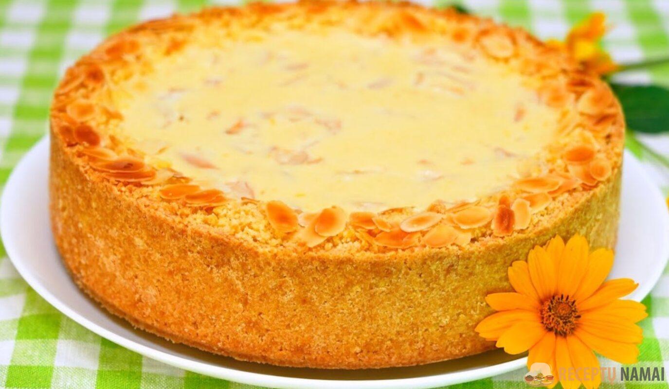 Jei norite, pyragą galite papuošti migdolų žiedlapiais. Iškepusį pyragą palikite atvėsti formoje, o jei norite, kad jis būtų tirštesnis, įdėkite į šaldytuvą.