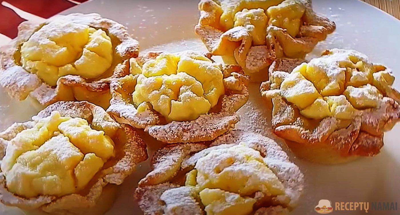 . Keksiukų formeles ištepkite sviestu ir lengvai pabarstykite miltais, sudėkite į jas tešlą. Į tešlą sudėkite įdarą ir šiek tiek užspauskite kraštus, kad susiformuotų rožė.