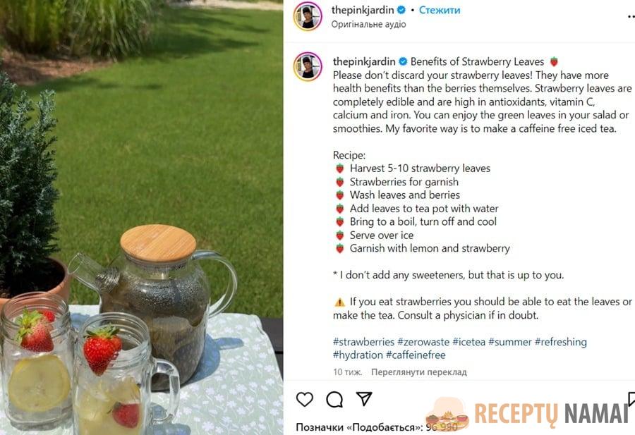 Vasarinės ledinės arbatos iš braškių lapų receptu internete pasidalijo garsi tinklaraštininkė ir sodininkė iš JAV Jill Hinds.