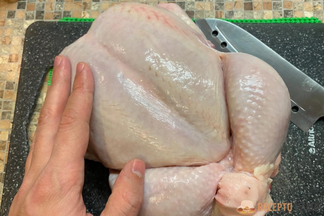 Ją reikia pjaustyti išilgai krūtinėlės. Tada padarykite įpjovas po pažastimis ir skylutes nugarinės dalyje. Taip mėsa greičiau marinuosis ir greičiau įsigers prieskonių