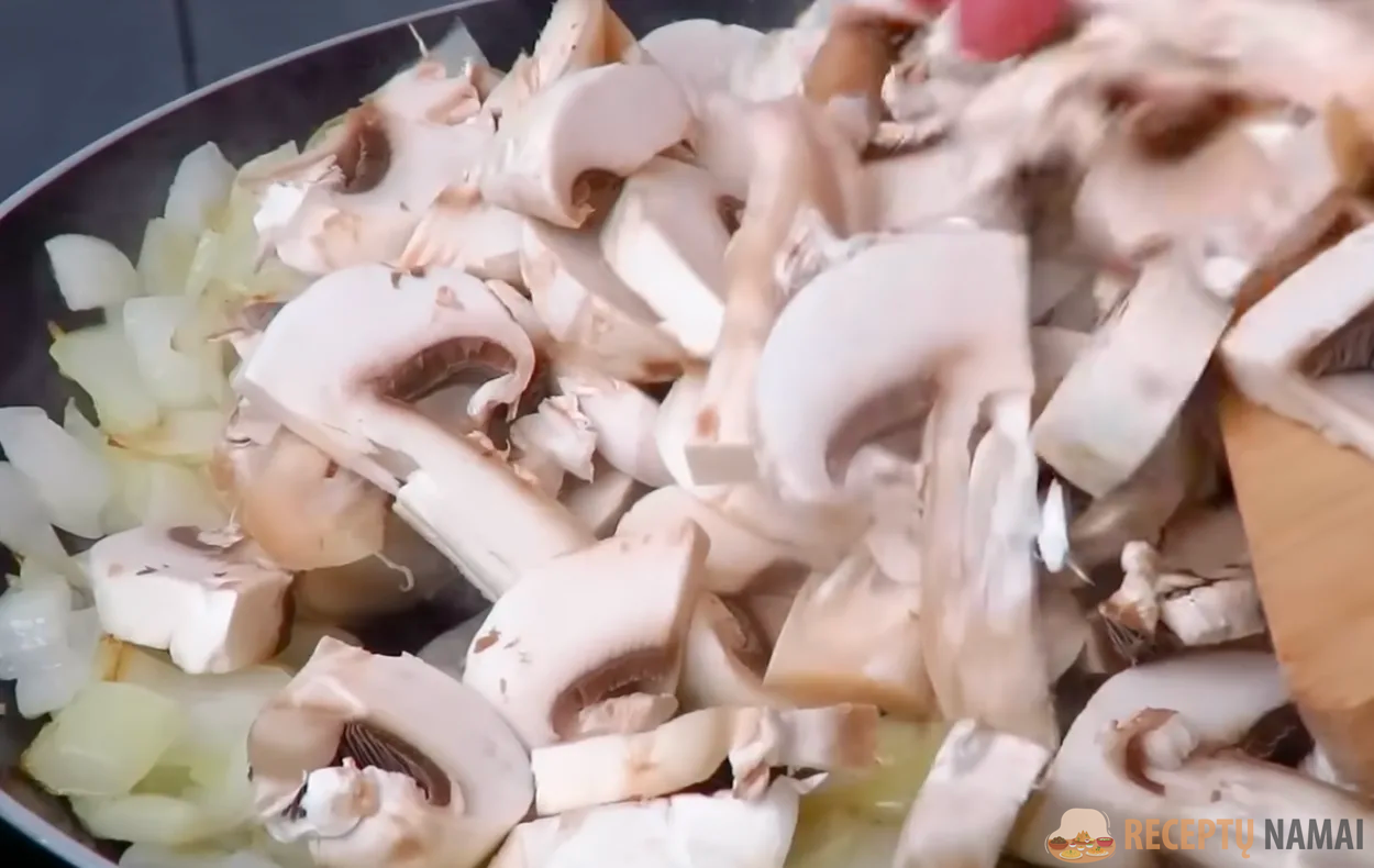 Svogūną supjaustykite vidutinio dydžio gabalėliais. Grybus supjaustykite bet kokia norima forma – jie vis tiek bus smulkinti. Keptuvėje įkaitinkite šiek tiek aliejaus. Pirmiausia pakepinkite svogūną iki auksinės rudos spalvos. Sudėkite grybus ir kepkite, kol jie paruduos ir išgaruos skysčio perteklius. Nuimkite nuo ugnies ir leiskite šiek tiek atvėsti.