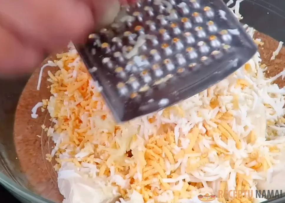 Lydytą sūrį sutrinkite šakute (arba sutarkuokite, jei kietas). Kiaušinius sutarkuokite smulkia tarka. Sudėkite smulkintą česnaką ir žoleles.
