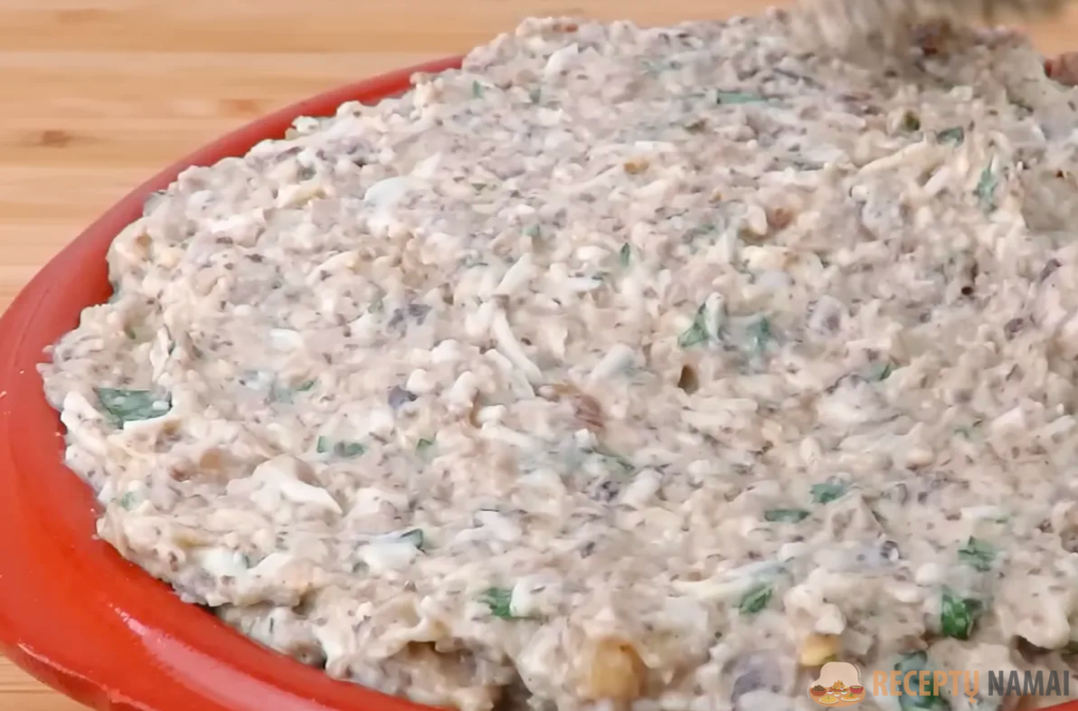 Grybus ir svogūnus sutrinkite trintuvu – ne iki tyrės, o taip, kad liktų gabalėlių. Supilkite į sūrio ir kiaušinių mišinį. Įberkite druskos, pipirų, džiovinto česnako ir majonezo. Gerai išmaišykite iki vientisos, kreminės konsistencijos.