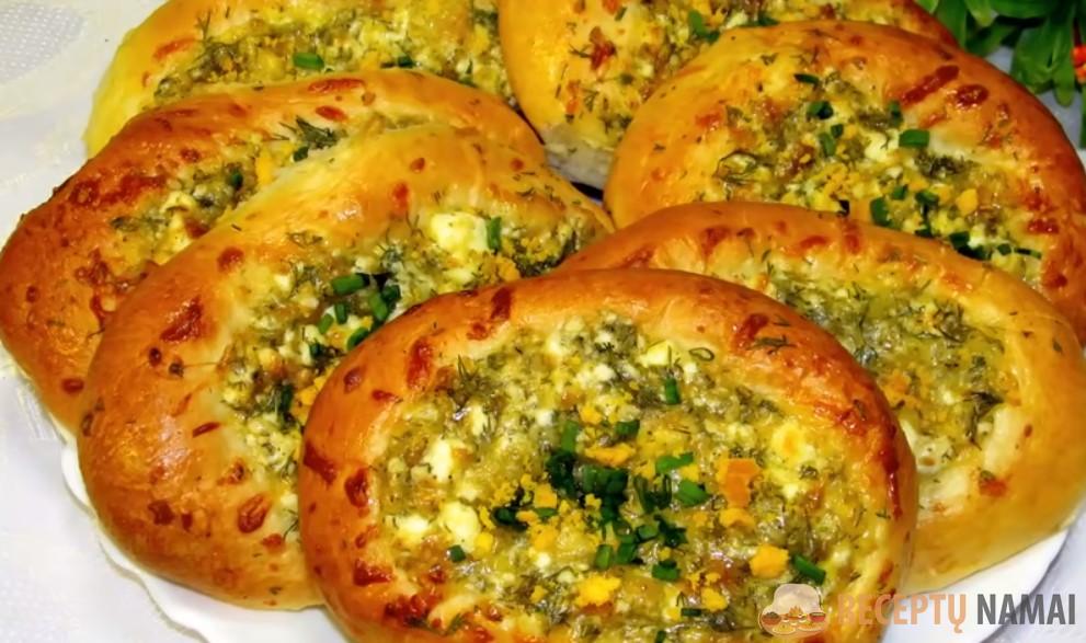 kiekvieną dalį iškočiokite į plokštainį ir į vidurį įdėkite 2 valgomuosius šaukštus įdaro.
