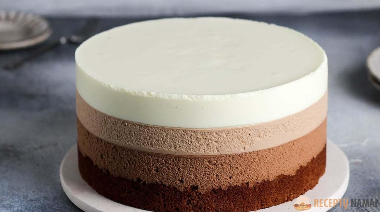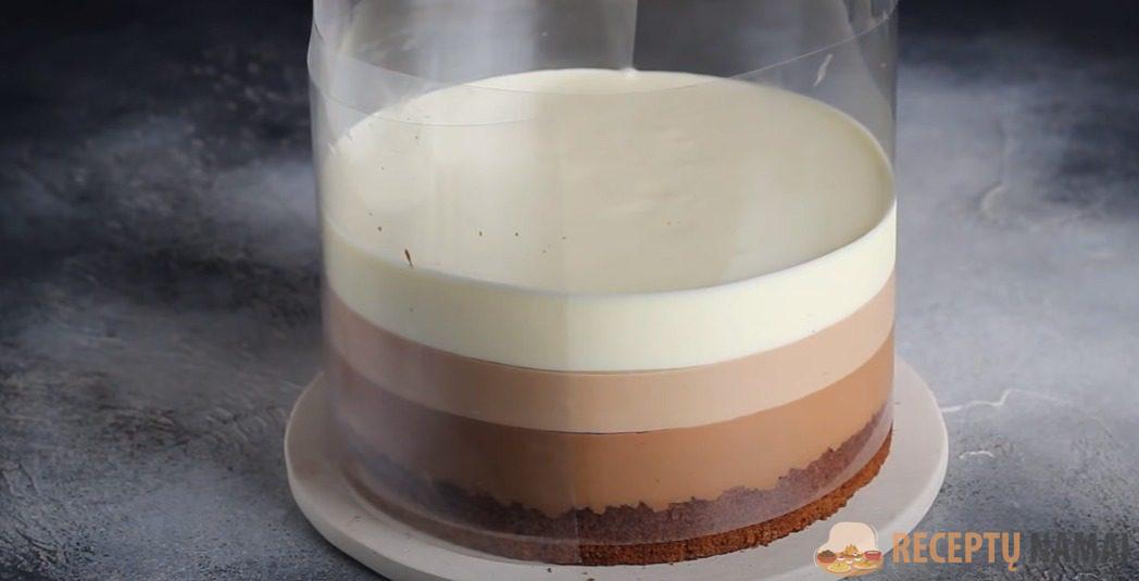Veiksmą pakartokite su pienišku šokoladu. Kai šis sluoksnis sukietės, paruoškite baltojo šokolado sluoksnį. Vietoj sirupo į jį supilkite pieną. Kai šis sluoksnis sustings, nuimkite šonus ir foliją. Tortą galite patiekti tokį, koks jis yra, arba papuošti pagal savo skonį.