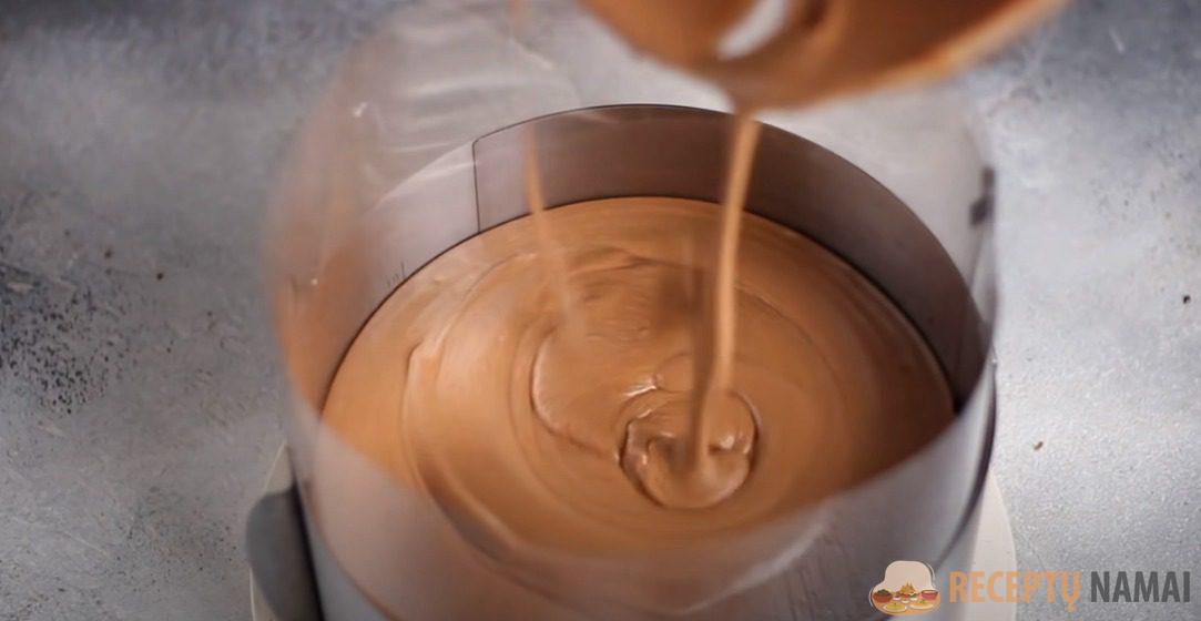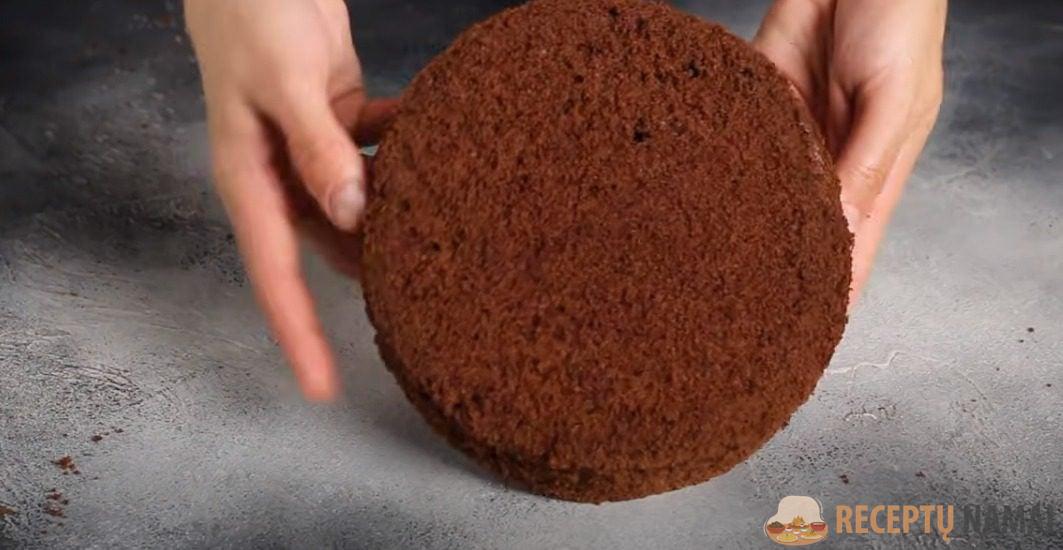 Išplakite grietinėlę ir sumaišykite su šokolado mišiniu. Išmaišykite, kad susimaišytų. Supilkite ant biskvito viršaus ir 30 minučių nusiųskite į šaldytuvą.
