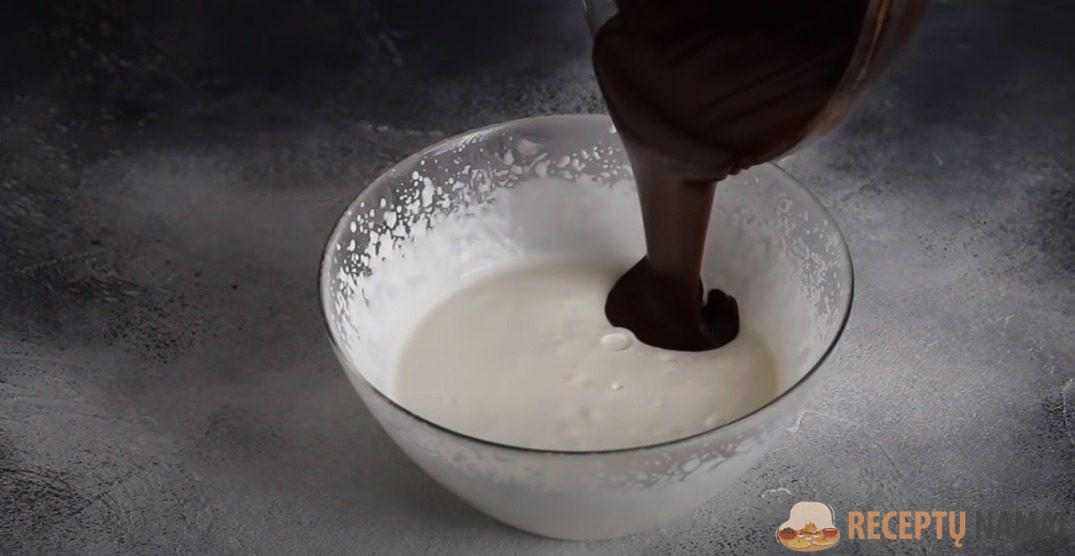 Išplakite trynius, įberkite vanilinio cukraus. Toliau plakdami plona srovele supilkite šokolado ir sviesto mišinį. Miltus sumaišykite su kepimo milteliais ir suberkite į tešlą. Atskirai išplakite baltymus su cukrumi ir druska iki standžių putų. Atsargiai perkelkite ją į tešlą. Atsargiai maišykite, kad baltymai nenusėstų.