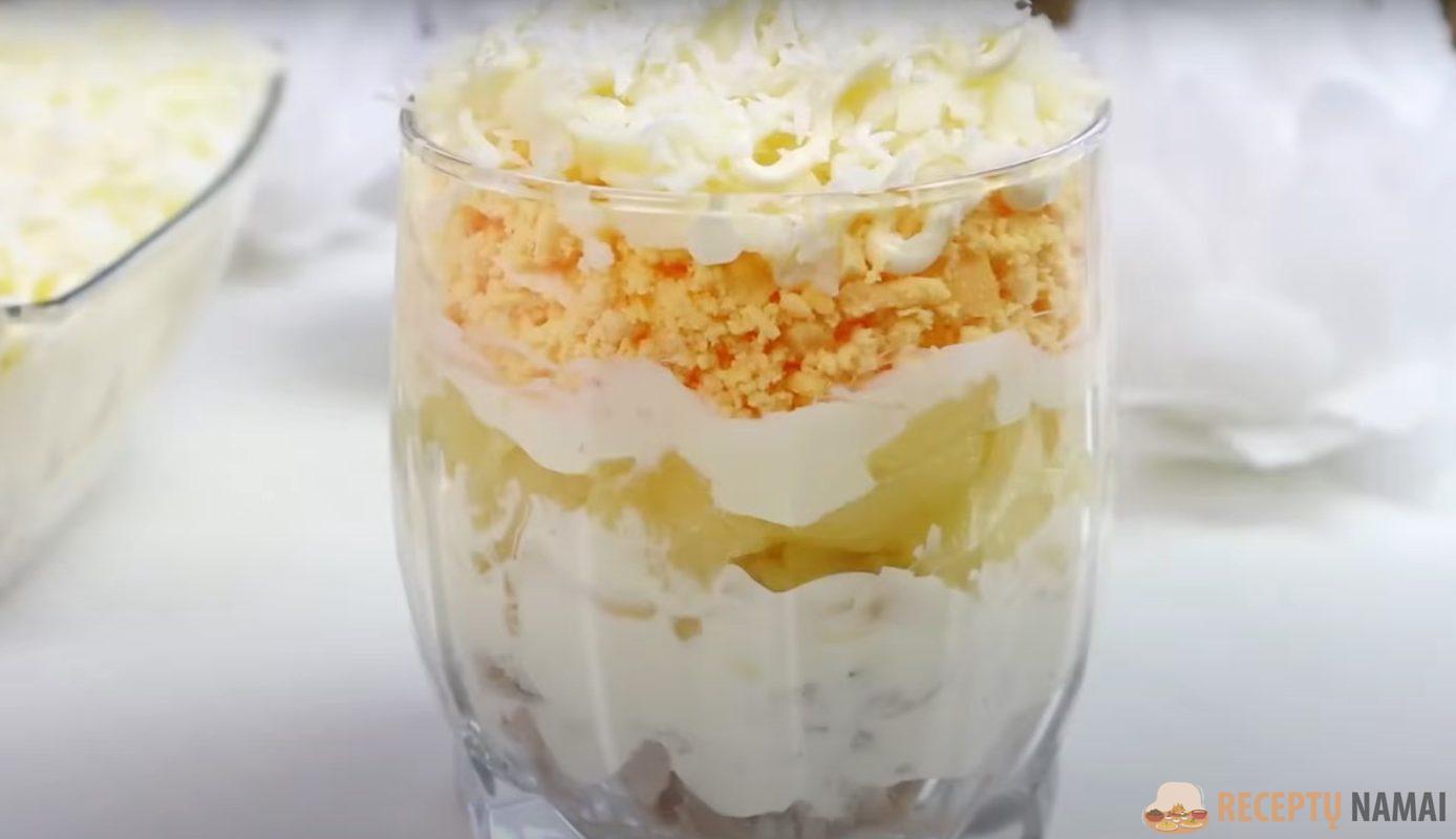 . Ananasus sudėkite ant vištienos sluoksnio, aptepkite majonezu. Ant ananasų sluoksnio užtepame sūrį, aptepame majonezu.