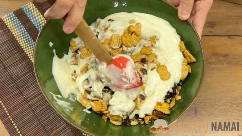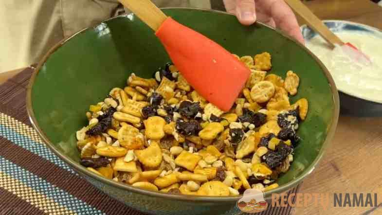 Sudėkite krekerius, sultenes, džiovintas slyvas, žemės riešutus, abrikosus, abrikosus ir graikinius riešutus ir išmaišykite. Jei turite didelį krekerį, sulaužykite jį į mažesnius gabalėlius.