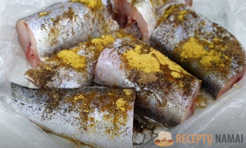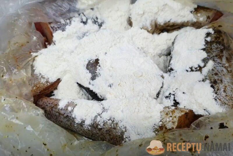 Apšlakstykite prieskoniais pagardintą polocką augaliniu aliejumi, užriškite ir pakratykite maišelį. Maišelį užriškite, pabarstykite žuvį miltais, vėl užriškite ir pakratykite.