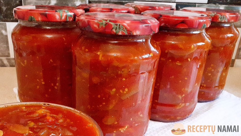 Apkepkite svogūną ir česnaką, sudėkite nuluptus ir supjaustytus pomidorus, troškinkite 40–60 minučių. Pabaigoje suberkite prieskonius, sutrinkite trintuvu ir užsandarinkite steriliuose stiklainiuose.