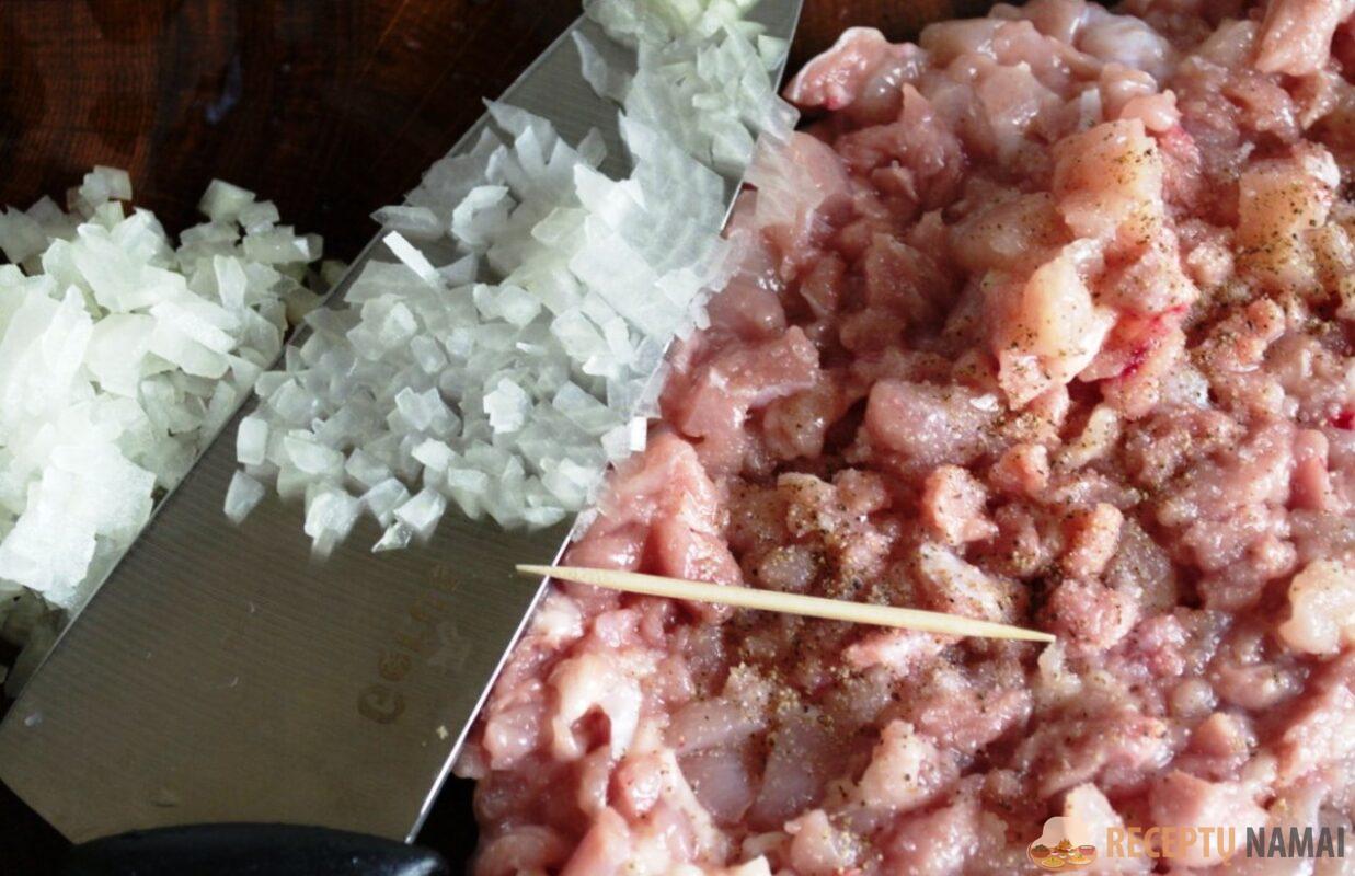 Nepamirškite įdėti smulkintų svogūnų. Ir būtina laikytis proporcijų: vienam kilogramui maltos mėsos – svogūnas. Susmulkinti daržovę galima bet kokiu prieinamu būdu;