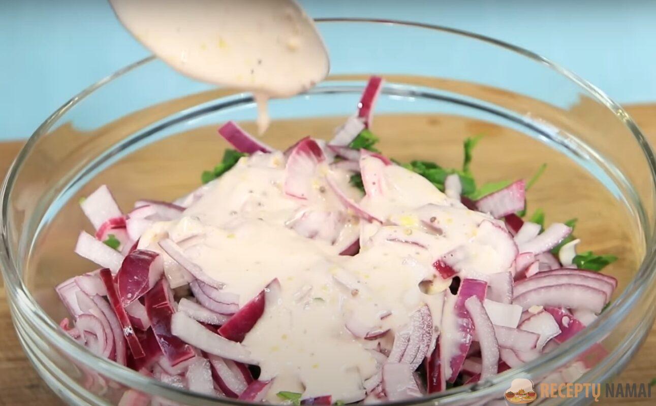 . Salotas užpilkite padažu ir gerai išmaišykite