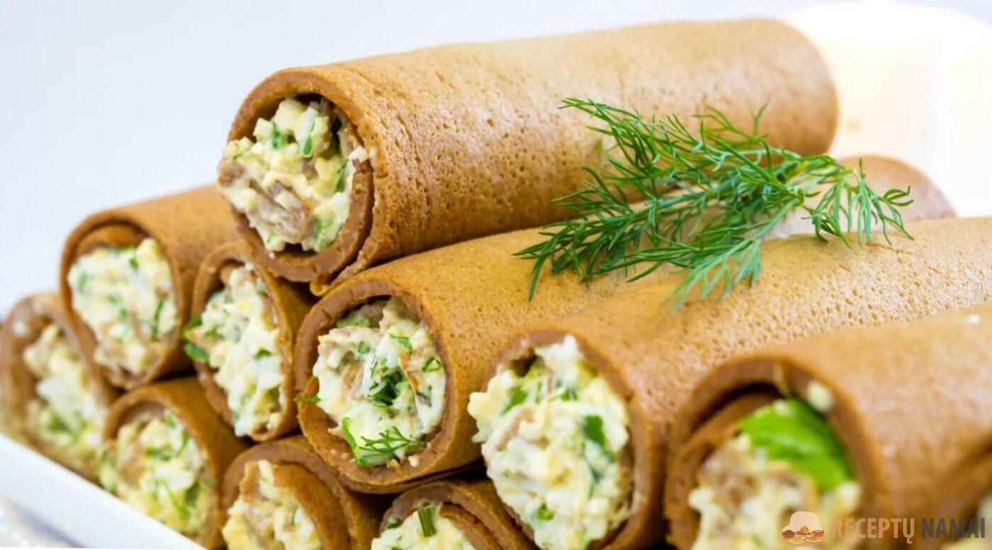Į kiekvieną blynelį dėkite po šaukštą įdaro ir suvyniokite į vamzdelį.