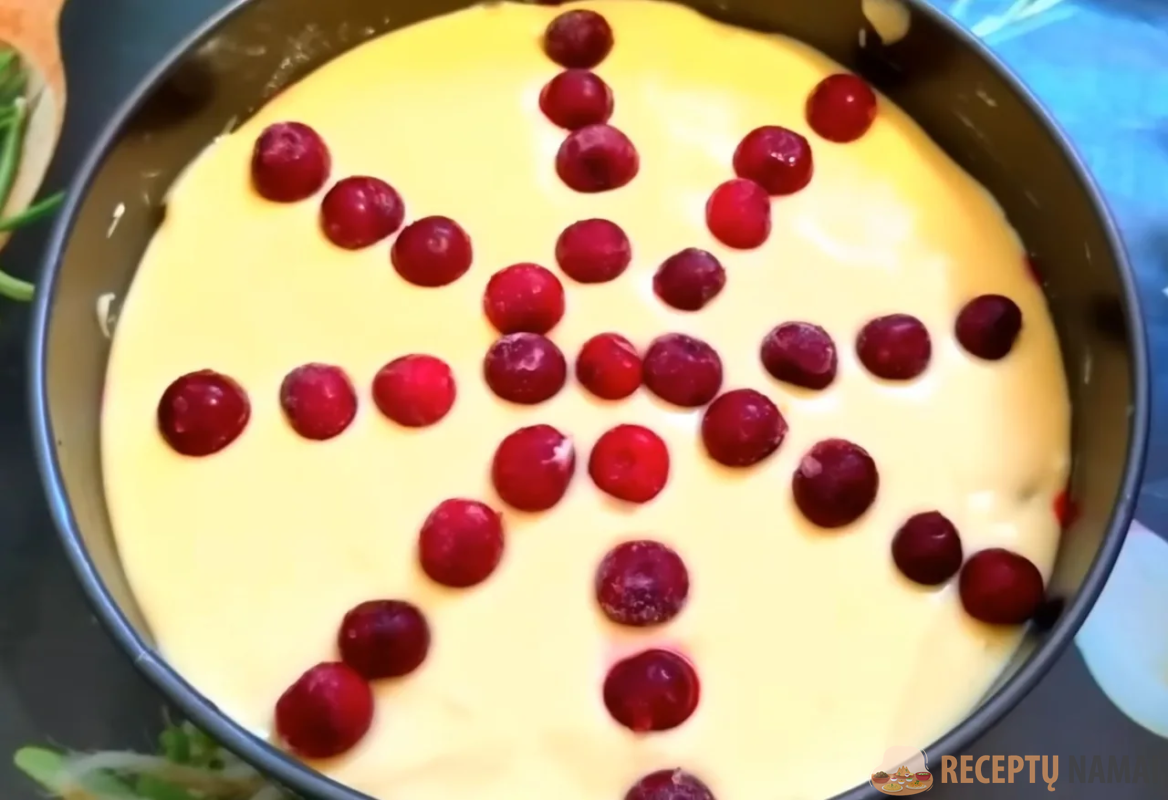 Kepimo indą ištepkite sviestu, supilkite į jį dalį tešlos. Ant tešlos sudėkite vyšnias ir uždenkite antrąja tešlos dalimi.